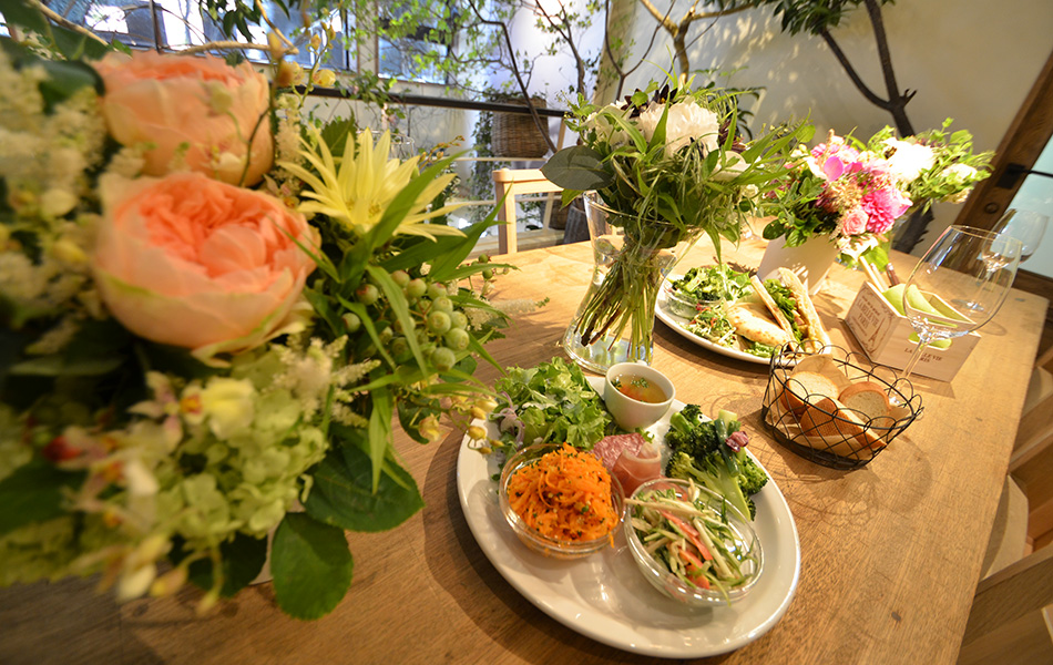料理研究家・関口絢子プロデュースの、厳選した新鮮野菜がたっぷり頂けるランチや健康や美容に役立つ食材を使ったバラエティに富んだメニューでお酒やお食事がお楽しみ頂けます。 フラワーデコレーションなど当店ならではの空間演出が可能なパーティスペースとして様々なシーンにお応え致します。